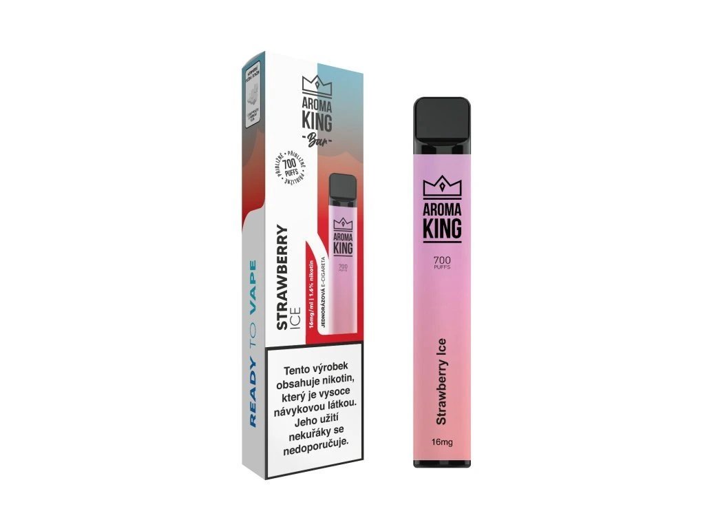 Jednorázová elektronická cigareta od polské značky Aroma King nabídne skvělou příchuť čerstvých jahod s ledovými tóny! Kapacita baterie je 550 mAh, takže vydrží alespoň na 700 potáhnutí. Značka Aroma King se pyšní především kvalitním zpracováním a výraznými příchutěmi, které dávají vapování zcela nový rozměr! Použití e-cigarety Aroma King je zcela jednoduché. Stačí ji vybalit z krabičky a začít vapovat. Uvnitř e-cigarety se skrývá náplň nebo-li liquid o objemu 2 ml. Obsah nikotinu je 16 mg/ml (1,6 %). Jednorázová e-cigareta nelze doplňovat ani dobíjet!