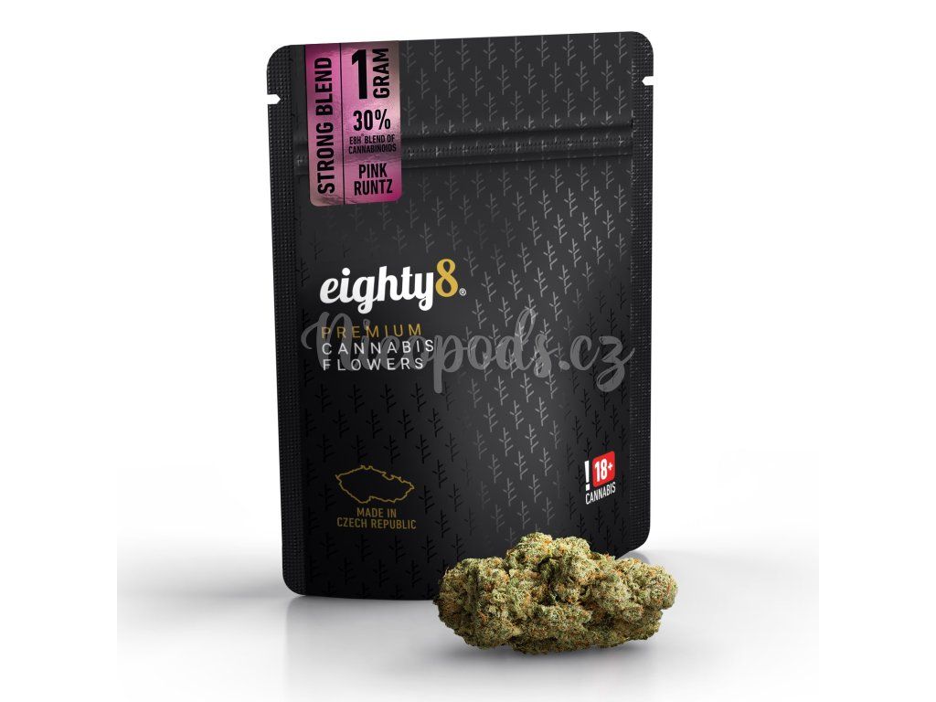 Konopné květy s příjemnou vůní borovice od české značky EIGHTY8 a vysokým obsahem kanabinoidního blendu E8HIGH. Obsah E8HIGH je 30% a hmotnost jednoho balení je 1 gram.