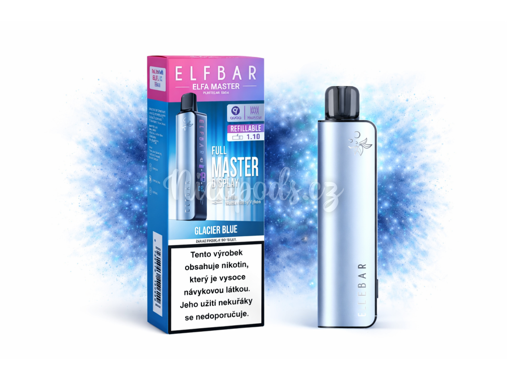 Plnitelná e-cigareta ELF BAR ELFA MASTER v zářivě lesklé modré barvě.