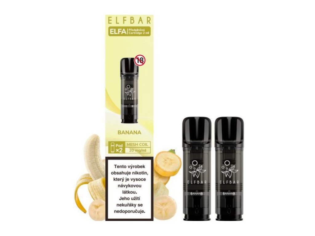 Předplněné Pody pro zařízení ELF BAR ELFA s velmi sladkou příchutí banánu. Balení obsahuje dva kusy předplněných Podů (cartridge) o objemu 2x 2 ml. Obsah nikotinové soli je 20 mg/ml. Příchutě jsou velmi autentické, stejně jako u jednorázových e-cigaret ELF BAR.