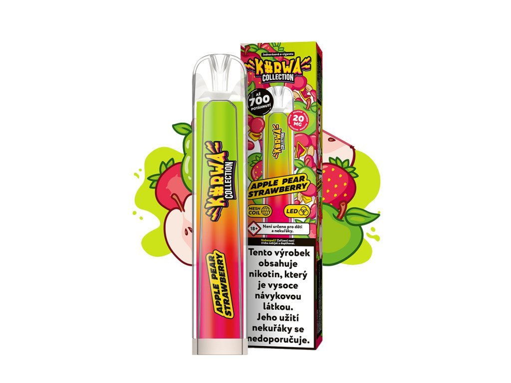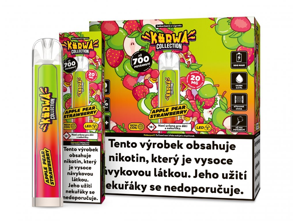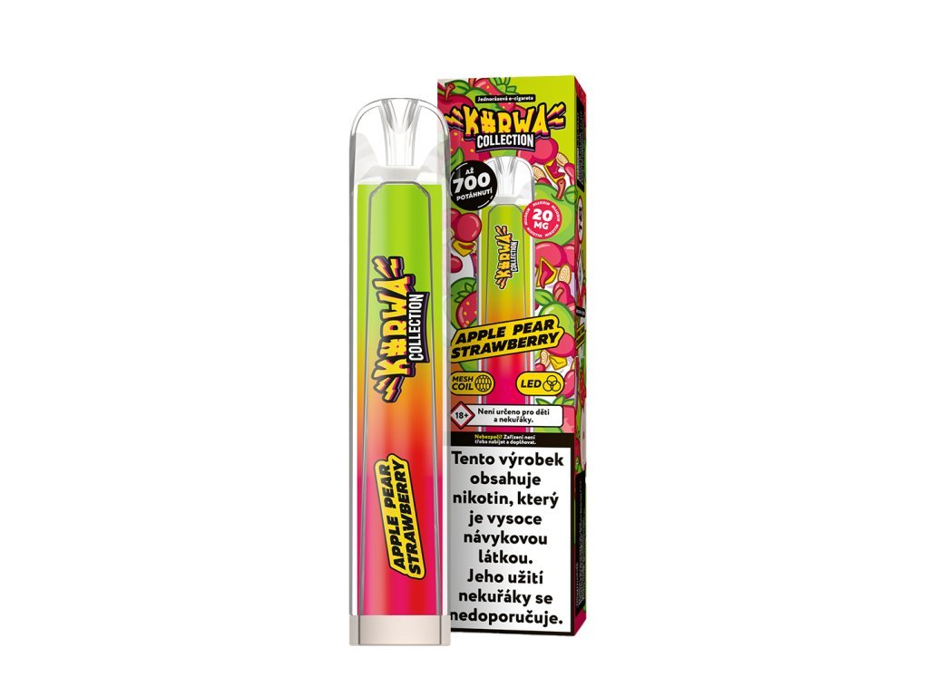 Jednorázová e-cigareta od oblíbené značky s neslušným jménem a ovocnou kombinací chutí jablka, hrušky a jahod! E-cigarety Kurwa Collection přichází na trh hned v několika skvělých chuťových mixech. Příchutě jsou velmi povedené a autentické. Oblibu si získají zejména u uživatelů, kteří preferují sladší chutě náplní.