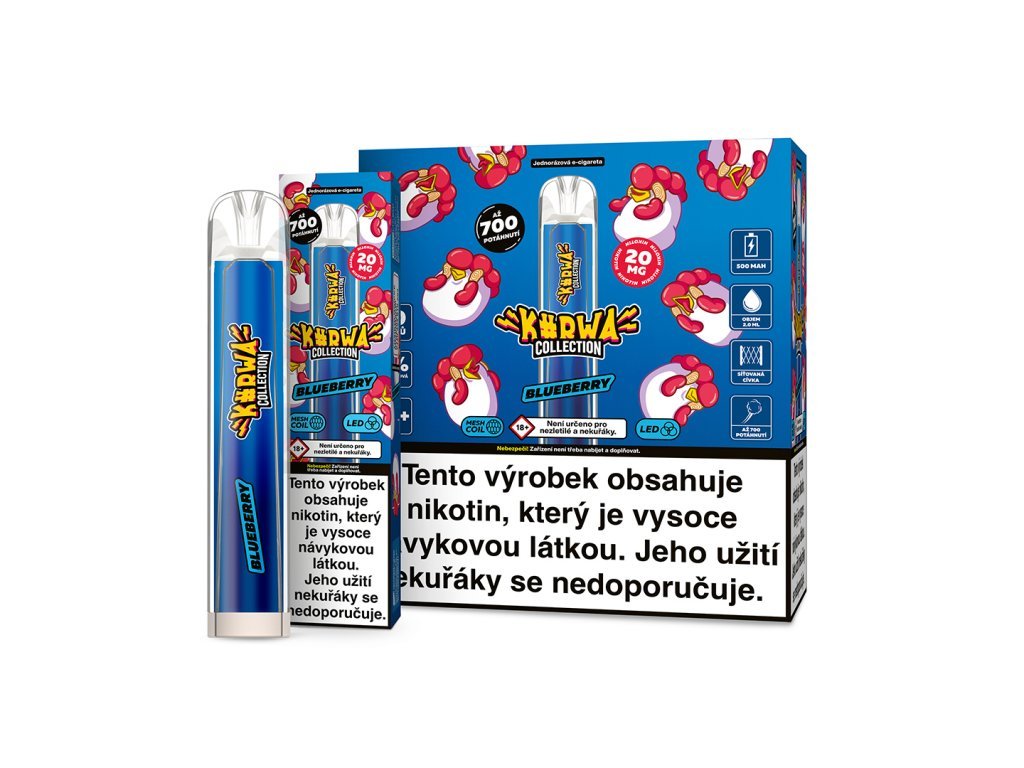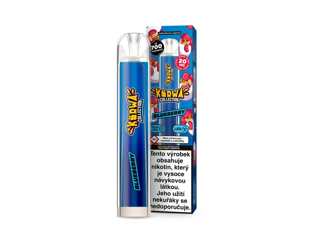 Jednorázová e-cigareta od oblíbené značky s neslušným jménem a sladkou příchutí lesních borůvek! E-cigarety Kurwa Collection přichází na trh hned v několika skvělých chuťových mixech. Příchutě jsou velmi povedené a autentické. Oblibu si získají zejména u uživatelů, kteří preferují sladší chutě náplní.