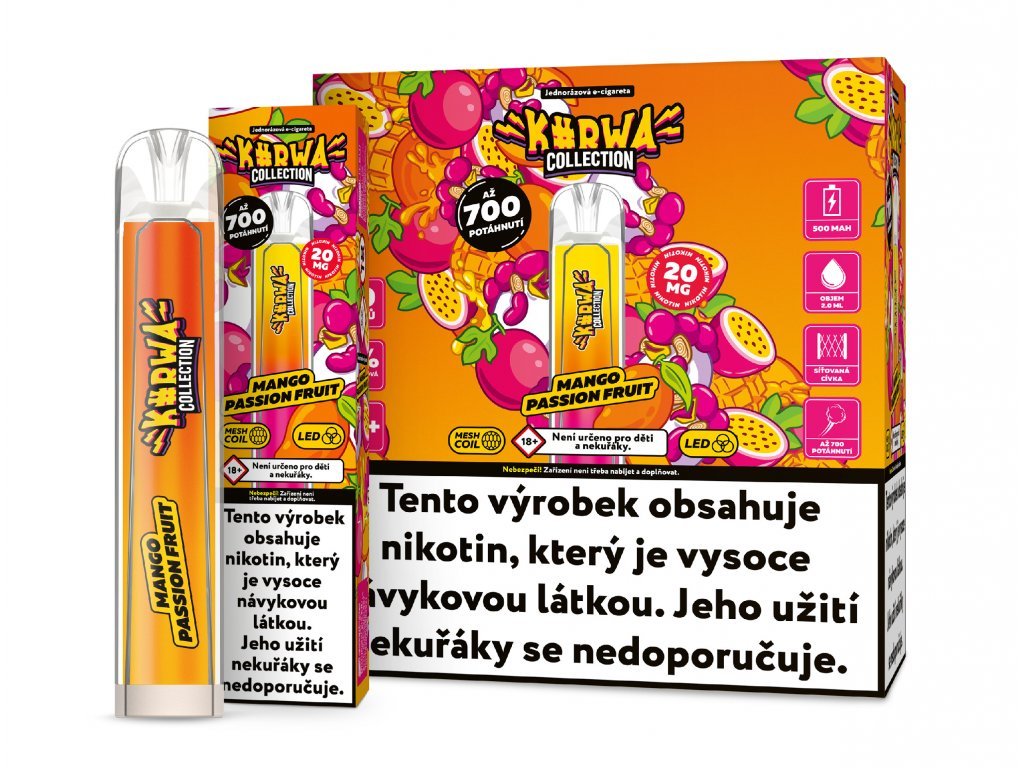 Jednorázová e-cigareta od oblíbené značky s neslušným jménem a exotickou kombinací chutí manga a maracuji! E-cigarety Kurwa Collection přichází na trh hned v několika skvělých chuťových mixech. Příchutě jsou velmi povedené a autentické. Oblibu si získají zejména u uživatelů, kteří preferují sladší chutě náplní.