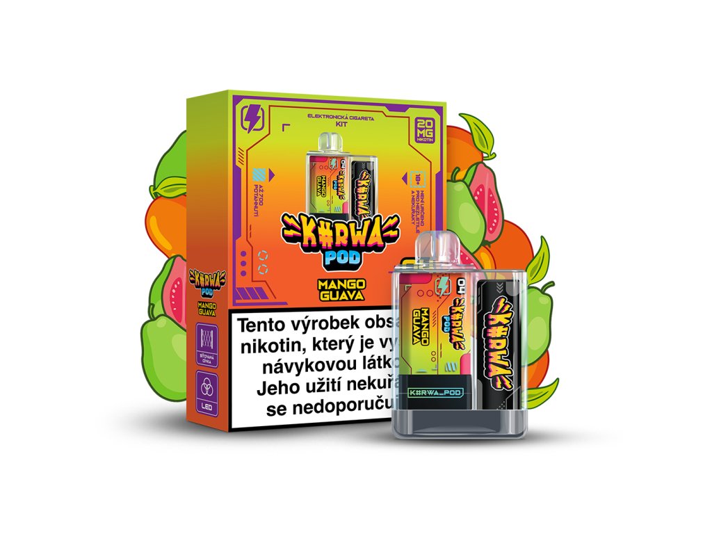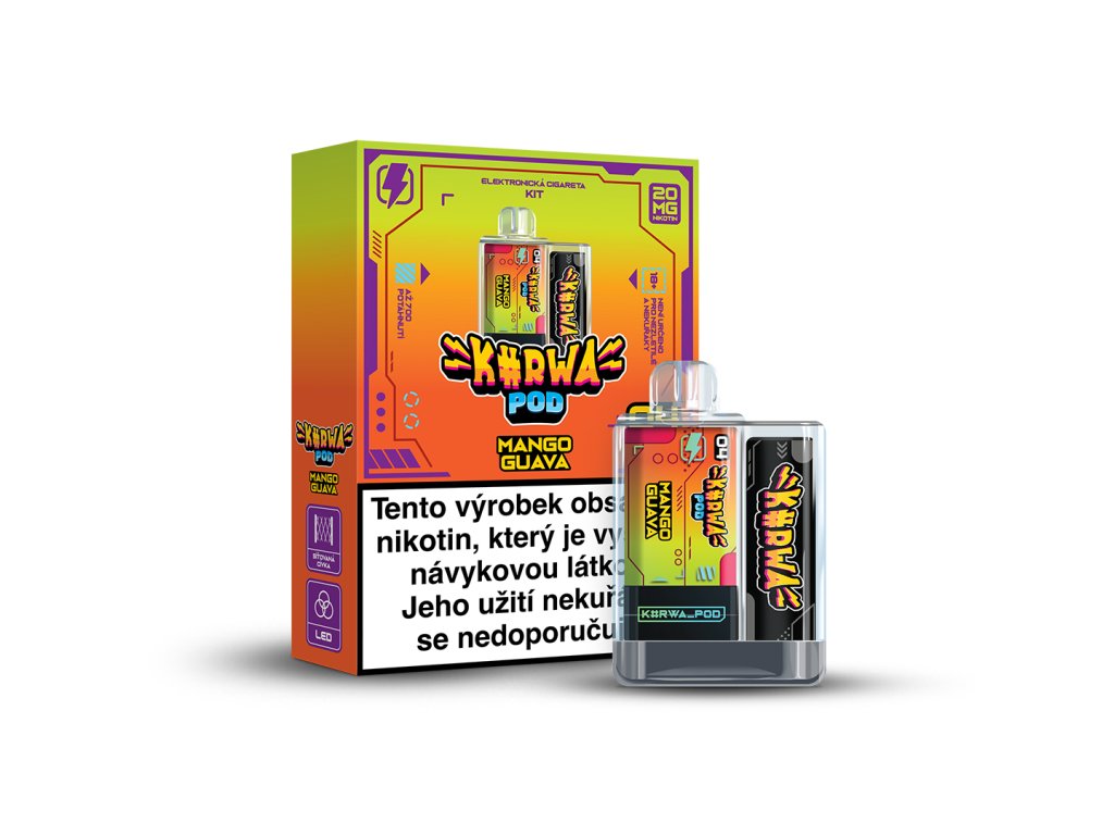 Startovací kit e-cigarety KURWA POD, které obsahuje výkonnou baterii s kapacitou 500 mAh a předplněnou cartridge s chuťovým mixem šťavnatého manga a tropické kvajávy. Objem náplně je 2 ml a vydrží Vám na 700 potáhnutí.