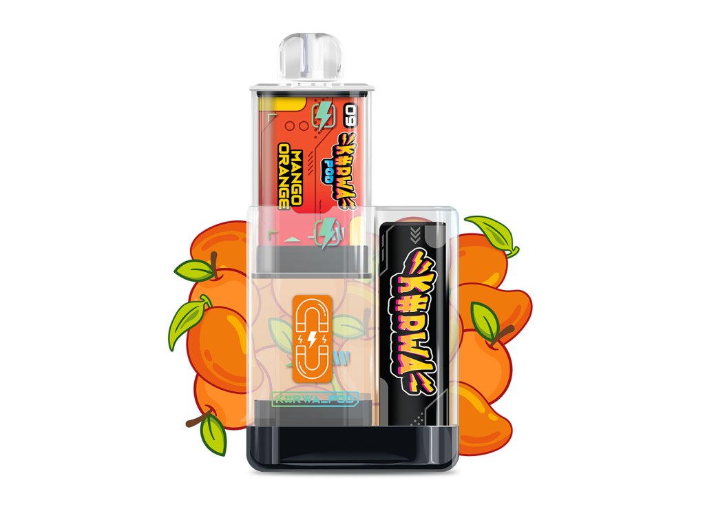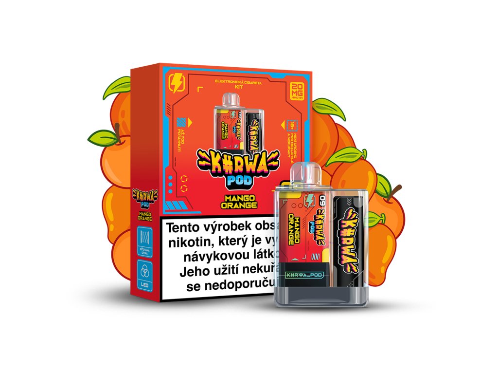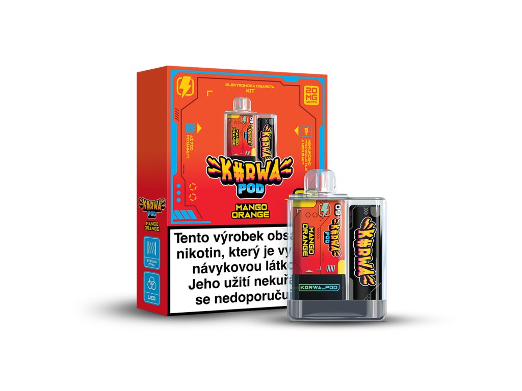 Startovací kit e-cigarety KURWA POD, které obsahuje výkonnou baterii s kapacitou 500 mAh a předplněnou cartridge s chuťovým mixem šťavnatého manga a sladkého pomeranče. Objem náplně je 2 ml a vydrží Vám na 700 potáhnutí.