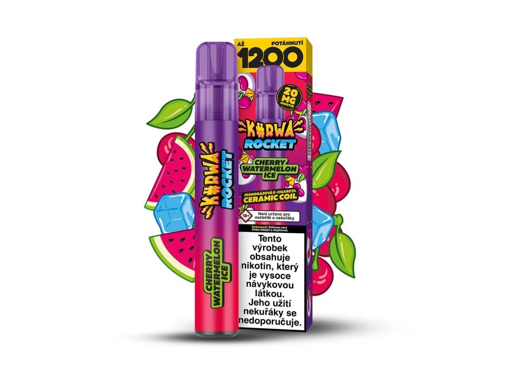 Jednorázová elektronická cigareta Kurwa Rocket s chuťovou kombinací sladkých třešní a svěžího melounu. E-cigareta obsahuje 20 mg/ml nikotinové soli a vydrží Vám až na 1200 potáhnutí!