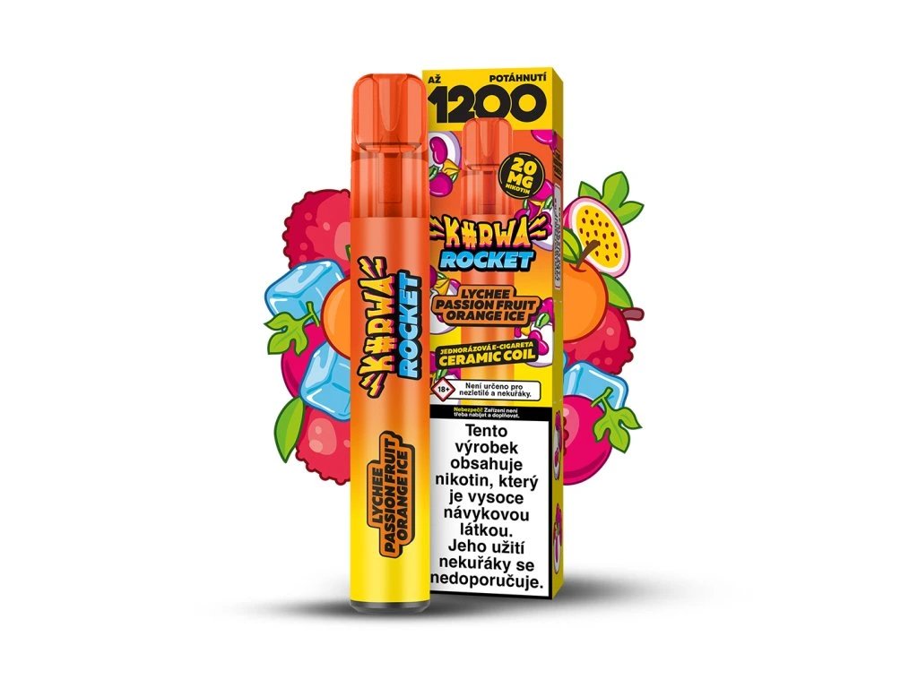 Jednorázová elektronická cigareta Kurwa Rocket s chuťovým mixem exotického liči, šťavnaté maracuji a pomeranče. E-cigareta obsahuje 20 mg/ml nikotinové soli a vydrží Vám až na 1200 potáhnutí!