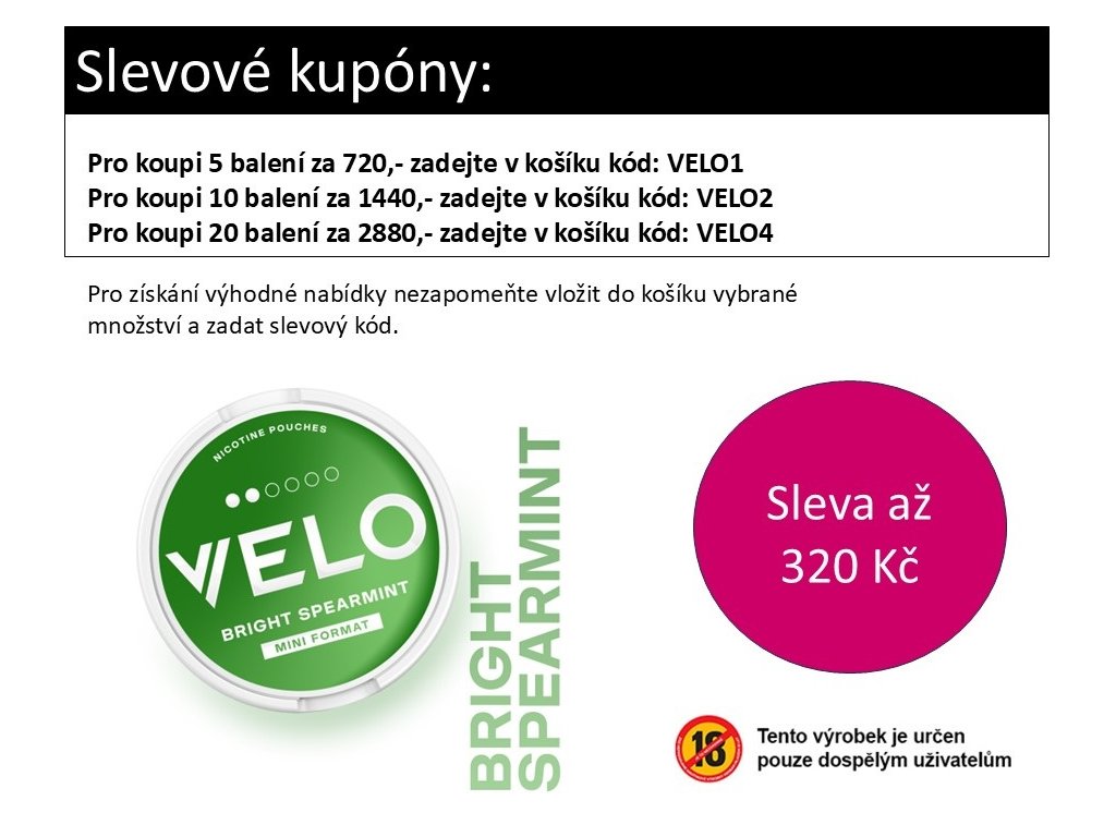 Výrobek VELO obsahuje nikotin, který je vysoce návykovou látkou. Tento výrobek není určen pro nezletilé a nedoporučuje se pro nekuřáky. Tento produkt může být nebezpečný pro zdraví.