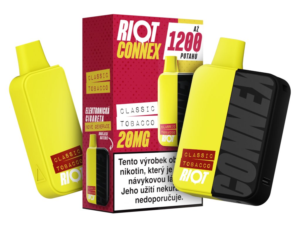 Startovací balení e-cigarety s technologií POD systém RIOT CONNEX obsahuje výkonnou baterii s kapacitou 500 mAh a dva kusy náplní s tradiční tabákovou příchutí a sladkými tóny.