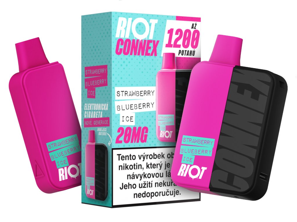Startovací balení e-cigarety s technologií POD systém RIOT CONNEX obsahuje výkonnou baterii s kapacitou 500 mAh a dva kusy náplní se sladkým mixem příchutí sladkých jahod a borůvek doplněnou o ledové tóny.