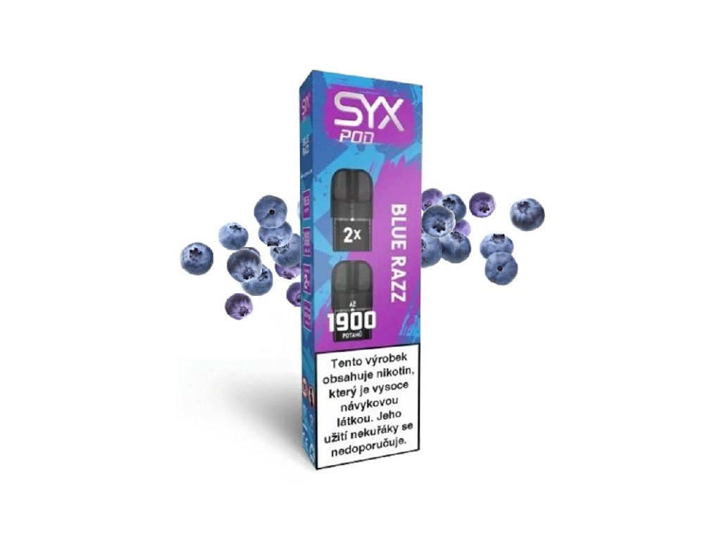 Replacable cartridge for POD system e-cigarette SYX with sweet blue raspberry and blueberry flavor.