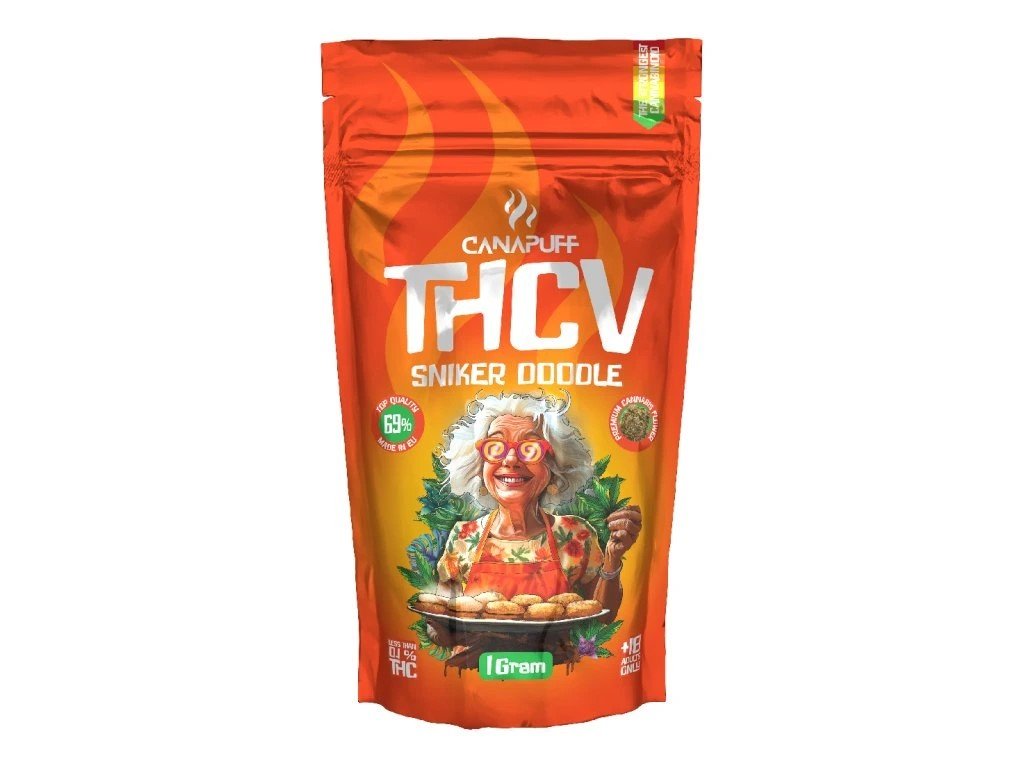 THCV květy Sniker Doodle s krásnou nasládlou vůní a jemnými tóny vanilky od značky Canapuff. Účinky jsou velmi podobné účinkům THC, jako jsou pocity euforie, zvýšená tepová frekvence a zlepšení nálady.