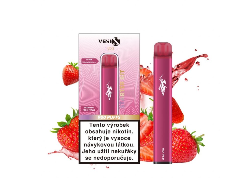 Výhodné startovací balení e-cigarety se systémem předplněných podů VENIX MAX, které obsahuje: 1x e-cigaretu VENIX MAX v nádherné růžové barvě, 1x předplněný POD s ovocnou chutí sladkých jahod a 1x dobíjecí USB-C kabel.