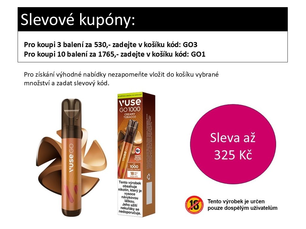 Intenzita nikotinu: 18 mg/ml, celkový obsah nikotinu v každém zařízení Vuse GO 1000: 36 mg