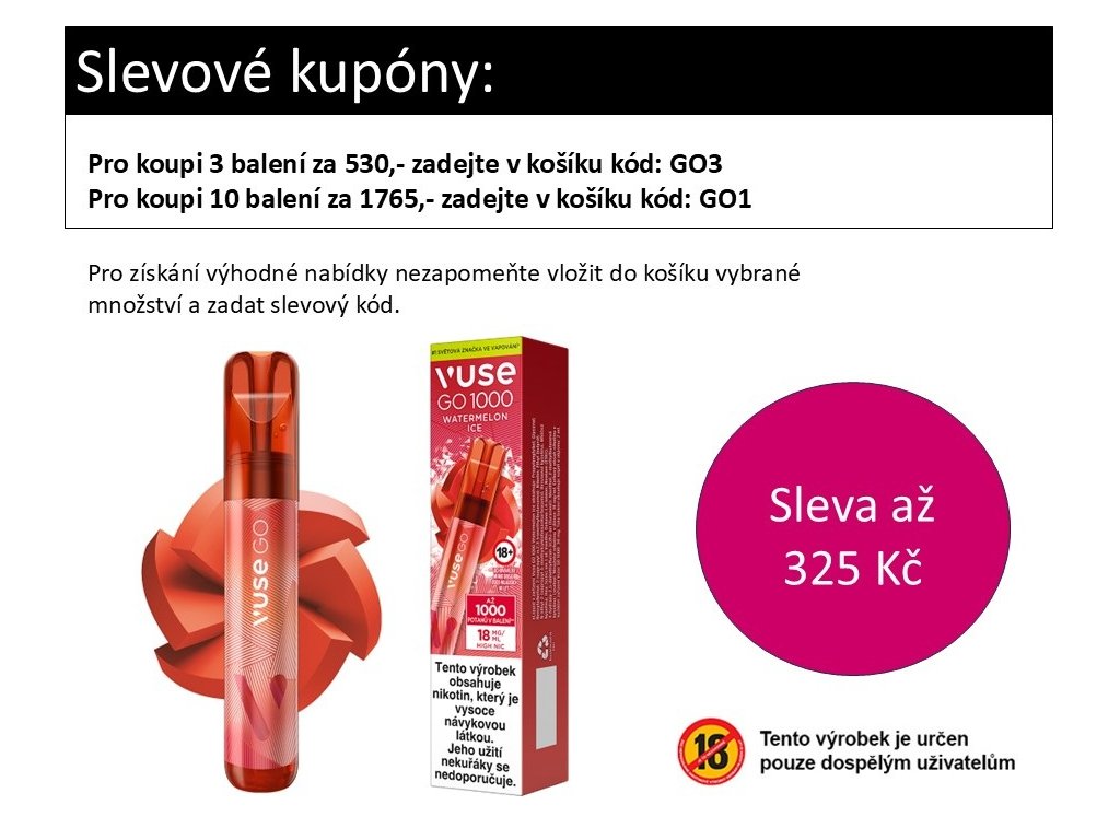 Intenzita nikotinu: 18 mg/ml, celkový obsah nikotinu v každém zařízení Vuse GO 1000: 36 mg